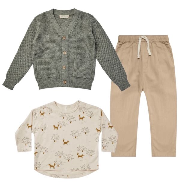 For the boys I’m really loving the Button Cardigan from Rylee and Cru. Back this season in a soft Marine color way, it looks great over the Long Sleeve Tee in Fox Forest and paired with the Ryder Pant in Putty.