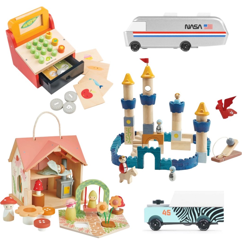 What about the first two years? It’s a time of growth and exploration and deserves it’s own category of toys where babies can feel, hear, taste, and sometimes even throw the toys designed just for them. Some of you may be familiar with Tegu’s magnetic wooden blocks which are great from age 1 through 99, but they also have a newer collection of magnetic toys specifically for toddlers. Fan favorites include the Magnetic Floating Stacker and the Magnetic Racer. The options get even broader when you move to the 18 months and up category. Tender Leaf Toys has some great choices. All of their products are handmade at a family run factory in Indonesia, using reclaimed rubber wood (a byproduct of the latex industry). They have eliminated single use plastic and use only non toxic plants and glues. We love the creativity encouraged by their charming Rainbow Tunnel and the sensory learning of their Touchy Feely Animals chunky puzzle set.