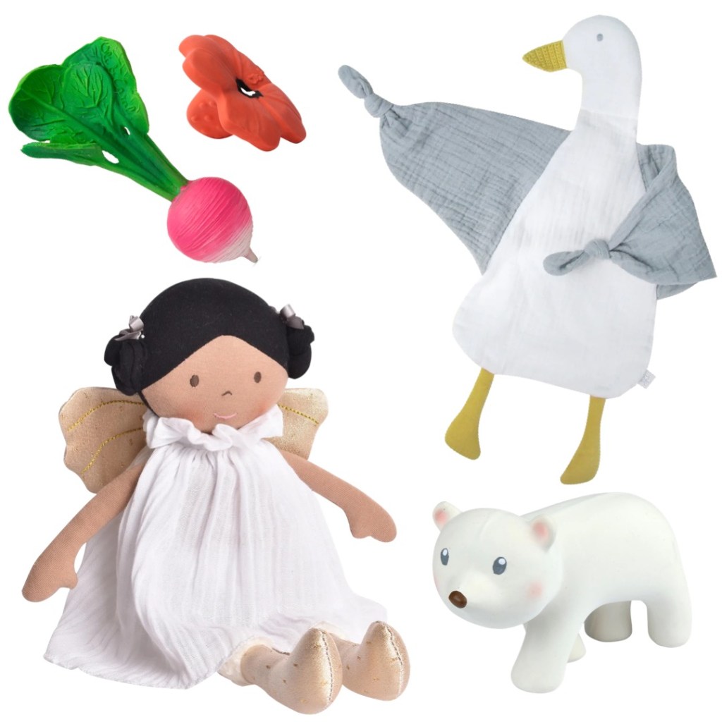 Our littlest customers have a great selection of soft and sweet items to choose from. New to the store is Tikiri Toys and its sister brand Bonikka Collection. They are a small family owned company based in Sri Lanka that uses only sustainable and natural materials. We have an assortment of winter themed natural rubber teethers, my favorite being the Polar Bear from their Arctic Animal Collection. Another popular new item is the Aurora or Angelina Doll from the Bonikka Collection, made with 100% organic fabrics. We also have new teether styles from store favorite Ollie & Carol. My absolute favorite is Ramona the Radish, but we also have new Chewy-To-Go styles in Poppy and Clover. Part pacifier & part teether they look absolutely adorable in your babies mouth. And finally, you can’t go wrong with the soft and sweet lovies from Albetta. Made from organic cotton cloth, they are perfect gift for baby’s first Christmas. My favorites are the Duck (which we think looks like a seagull) and the Bee.
