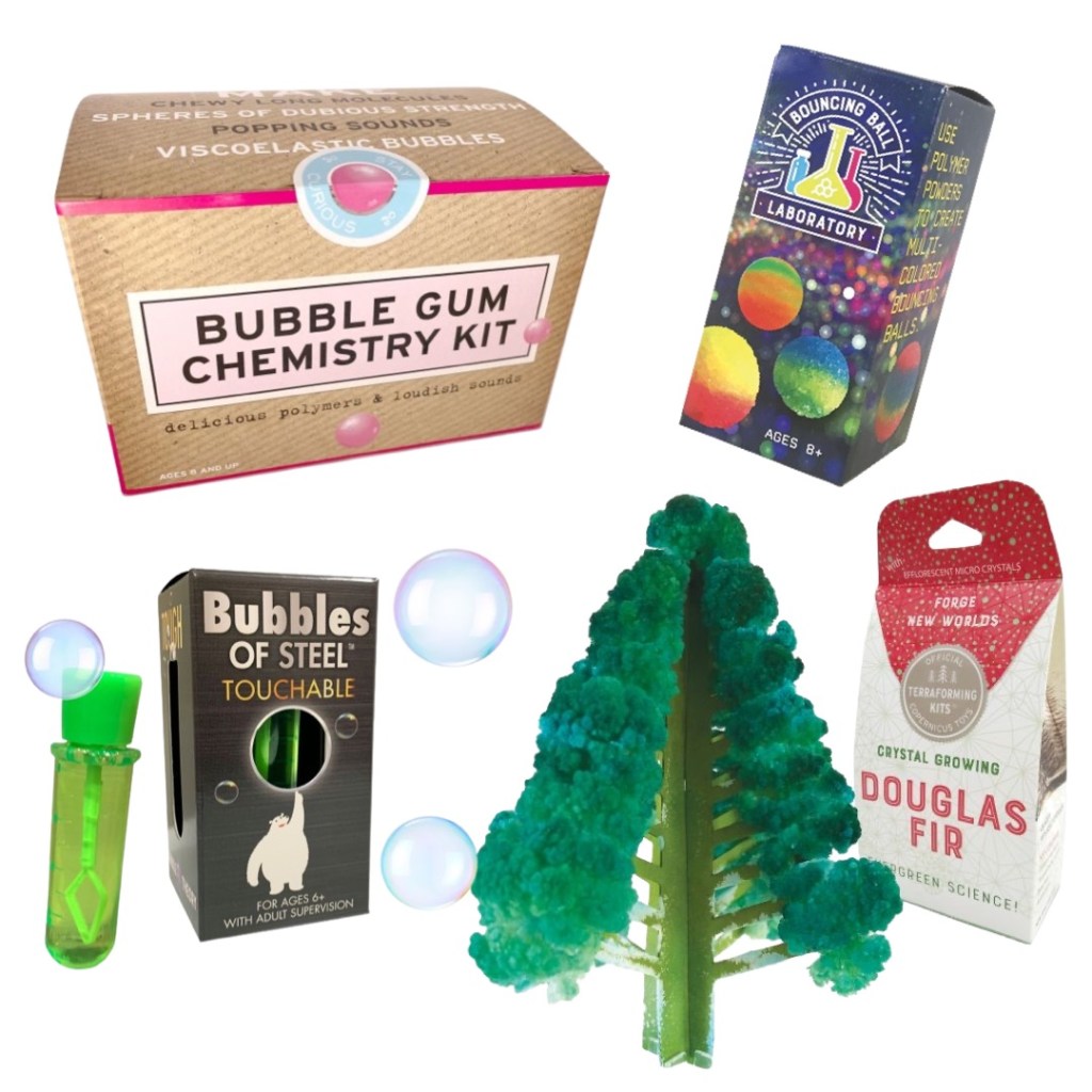 On the science side of things, we have several popular items from Copernicus Toys. We currently have the crystal tree growing kit in the seasonally appropriate Douglas Fir. And the DIY Bouncy Ball Kit and Bubble Gum Chemistry Kit are always a hit with kids 8 and over. New this season are the Touchable Bubbles of Steel. Kids can touch the bubbles and they won’t pop…they can even build bubble towers and sculptures that will last for several days if you are careful! You will officially blow their minds with these (pun intended).